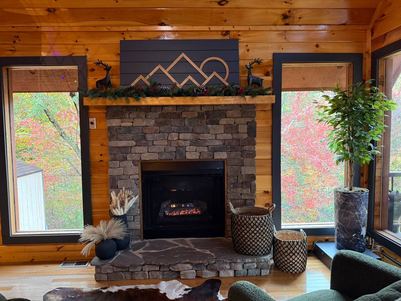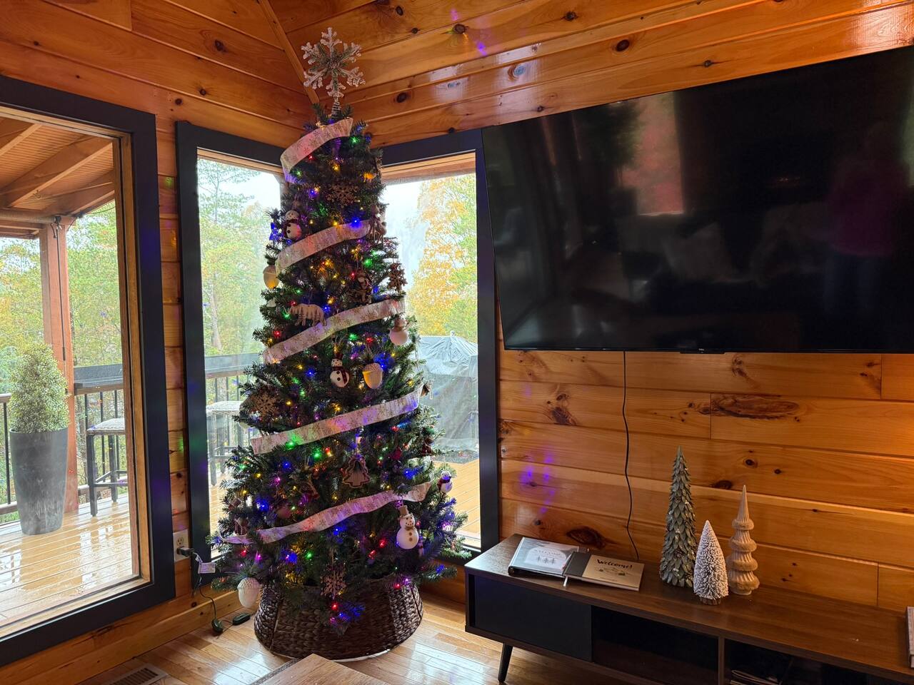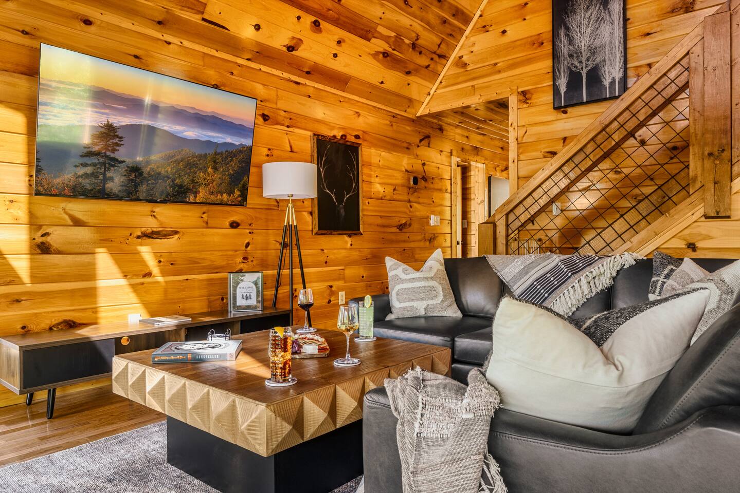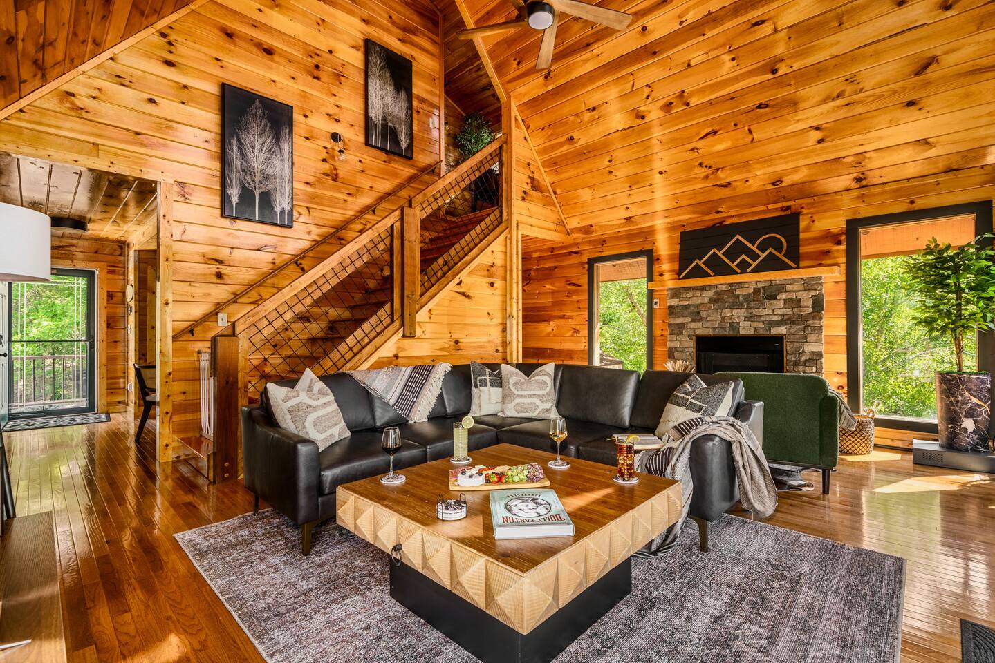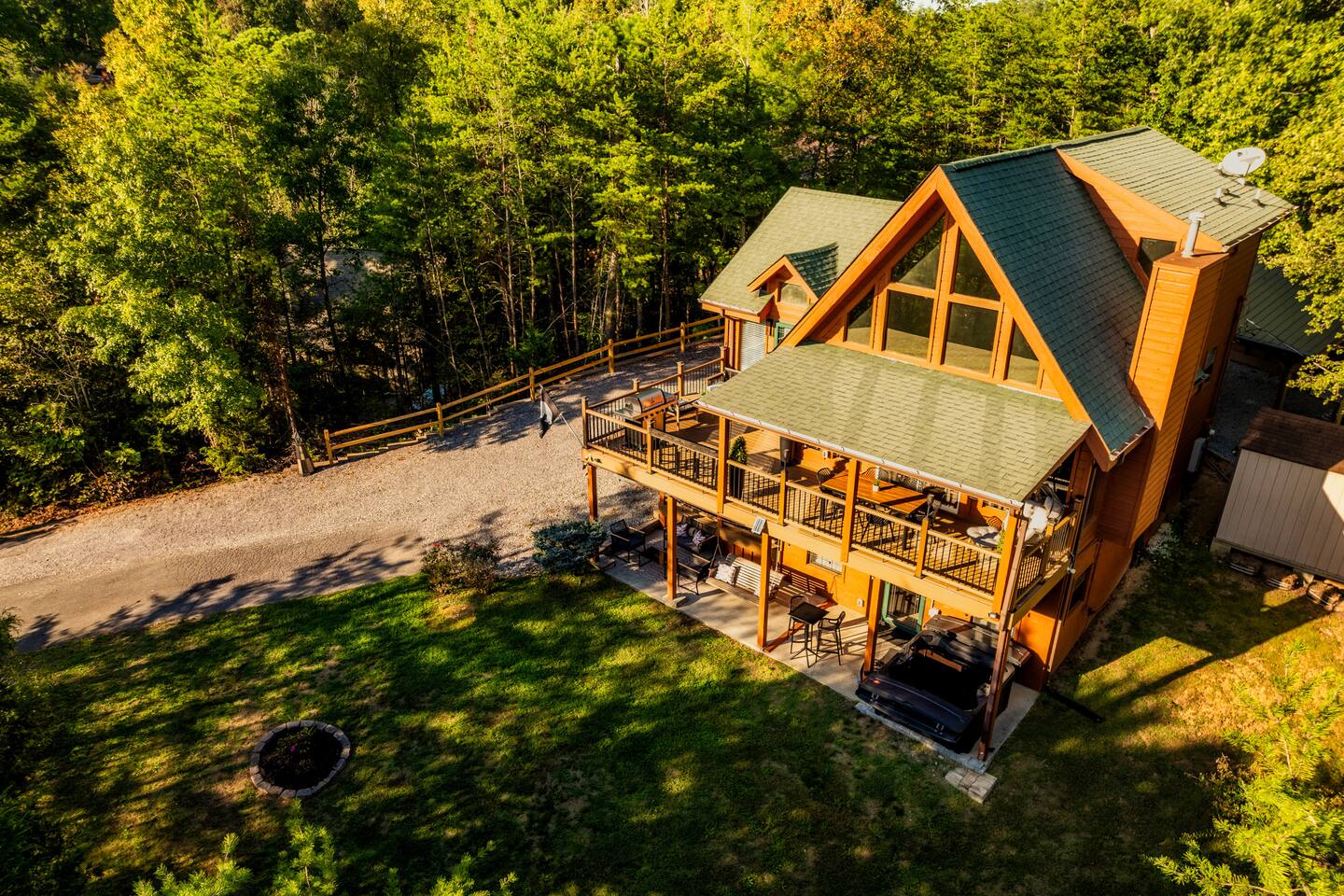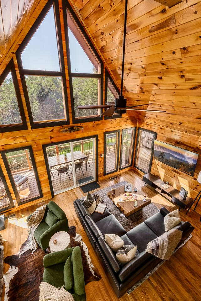 Enjoy a stylish experience at this centrally located cabin with a view! The cabin has gorgeous high cathedral ceilings and big floor to ceiling windows to bring in natural light. Knotty pine tongue and groove throughout. Brand new furniture decorated with a modern, cozy feel. In the morning, relax on the deck while taking in the view of the mountains. In the evening, enjoy the hot tub where you can see the view or relax with family around the fire pit. 11min Drive (typical) to Pkwy attractions HERE ARE A FEW KIND WORDS FROM PAST GUESTS: We have stayed in many cabins in the Great Smokey Mountains area, and this was our favorite by far! It was very easy to get to town from the cabin with smooth, paved roads. The cabin has been recently updated and is beautifully decorated with new furniture and decor. The details did not go unnoticed! I can’t wait to come back again and bring our kids. They would love the indoor and outdoor games. The only thing that could possibly have made our stay better would be to have seen a bear. :) -Andrea My family and I had a fantastic stay. This place was absolutely beautiful, and the interior design was delightful. It was just what we needed. We have no regrets. Our children and their friends built so many memories that I'm sure will last forever. Definitely need to return for a girl's weekend! -Karla Office Business Hours: 8am EST-8pm EST 7 days per week on Airbnb Messenger only. We are owner operated. We are real people with real jobs, just like you! BEDROOMS + BATHROOMS Each of the cabin’s 3 bedrooms is designed with guest comfort in mind. -King size bed - Large Dresser -2 nightstands with lamps -Roku TV Each bathroom is fully stocked for your convenience and comfort. -Shampoo & conditioner -Bodywash -Hand Soap & lotion -Plush towels Fall asleep and wake up refreshed for another exciting (or relaxing!) day in the mountains. Each bedroom is located on a different floor, allowing for privacy. Each bedroom has a King-sized bed. All beds have high quality, comfortable mattresses. Just like the bedrooms, the bathrooms are designed for comfort and relaxation. Each level of the cabin has a full-size bathroom. The main level bathroom and the upper bathroom are also connected to a bedroom, providing a guest suite. The lower-level bathroom is right outside of the lower-level bedroom making it very convenient. The main level has a large garden tub with jets. KITCHEN & DINING The kitchen is outfitted with all the cookware, dishes, utensils, dishwasher pods, and appliances you will need to cook delicious meals. There is a large dining table inside, but in nice weather, you will LOVE eating on the deck at the large dining table with the MOUNTAIN VIEWS. ⛰️ GAME ROOM -Queen size sleeper sofa -3 arcade games…Fast & Furious, Pac-Man and Street Fighter -Large shuffleboard table -Foosball table -Watch the big game on the 65” Smart TV -Full size washer and dryer LOFT STUDY This is a great area to work remotely. There are even beautiful mountain views from the desk! LIVING ROOM -65" Smart (Roku) TV -Sectional couch with mountain views -Cozy area to sit in front of the fireplace DECK -Large dining table with mountain views -Stools with a bar top to sip your coffee -Sitting area and egg chair -Gas grill -String lights LOWER-LEVEL PATIO -7-person hot tub -Porch Swing -Several areas to sit and enjoy family and friends. -2 Egg swings -String lights FIRE PIT -Wood burning fire pit, bring your own firewood or purchase locally. -8 Adirondack chairs -Park style charcoal grill, bring your own charcoal or purchase locally. -String lights CARPORT -This is an area that you can park your car to stay mostly dry on a rainy day or can be used to hang out and stay dry yourself. This is a 3-sided structure with a roof. -Patio lights -Corn hole -Water proof chest for storing outdoor pillows and throws for the fire pit area on cold nights.