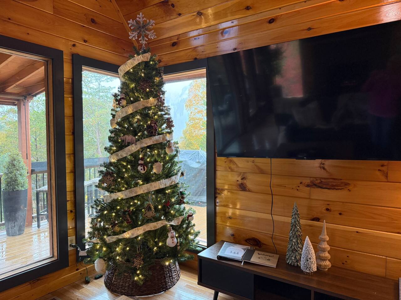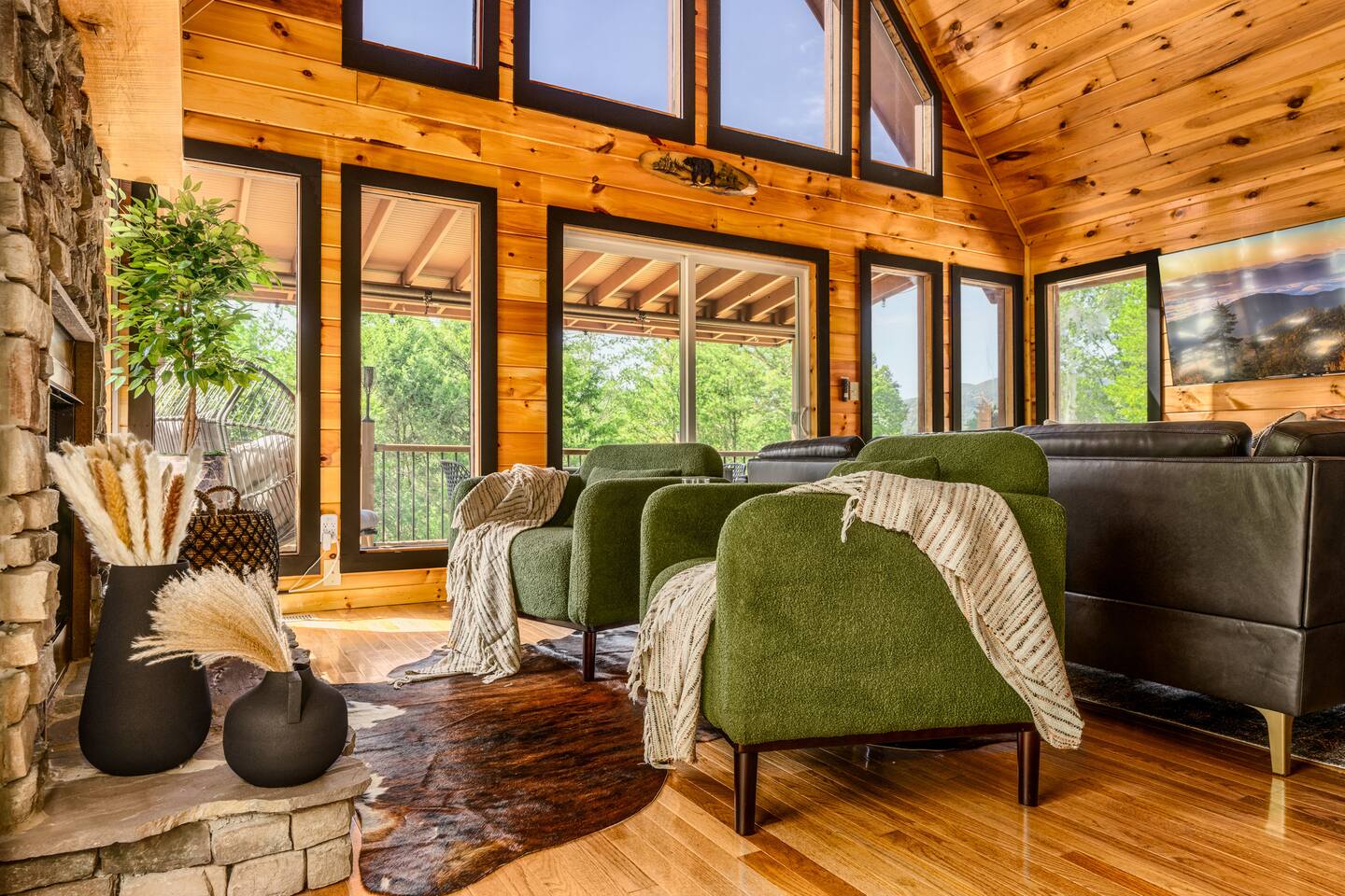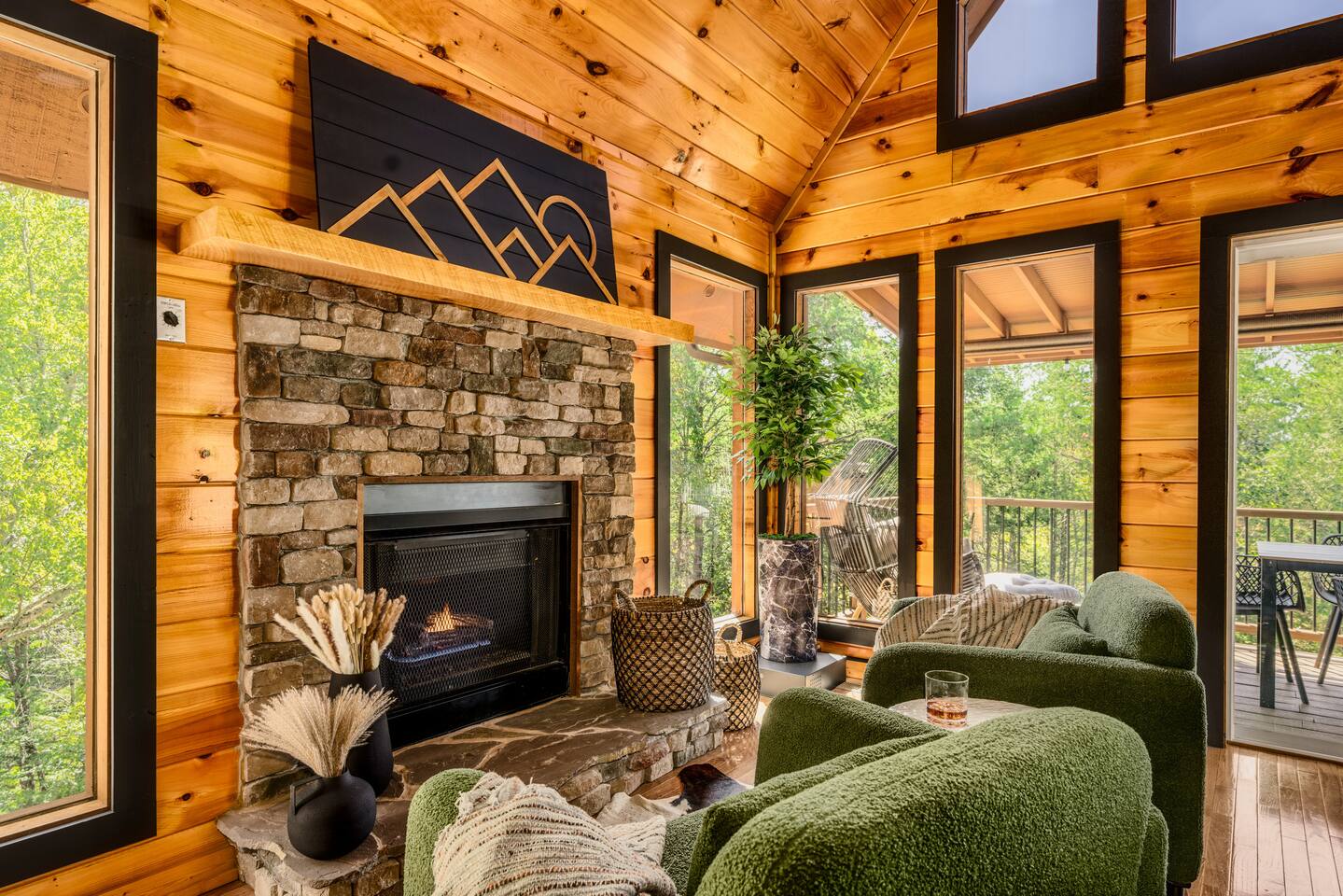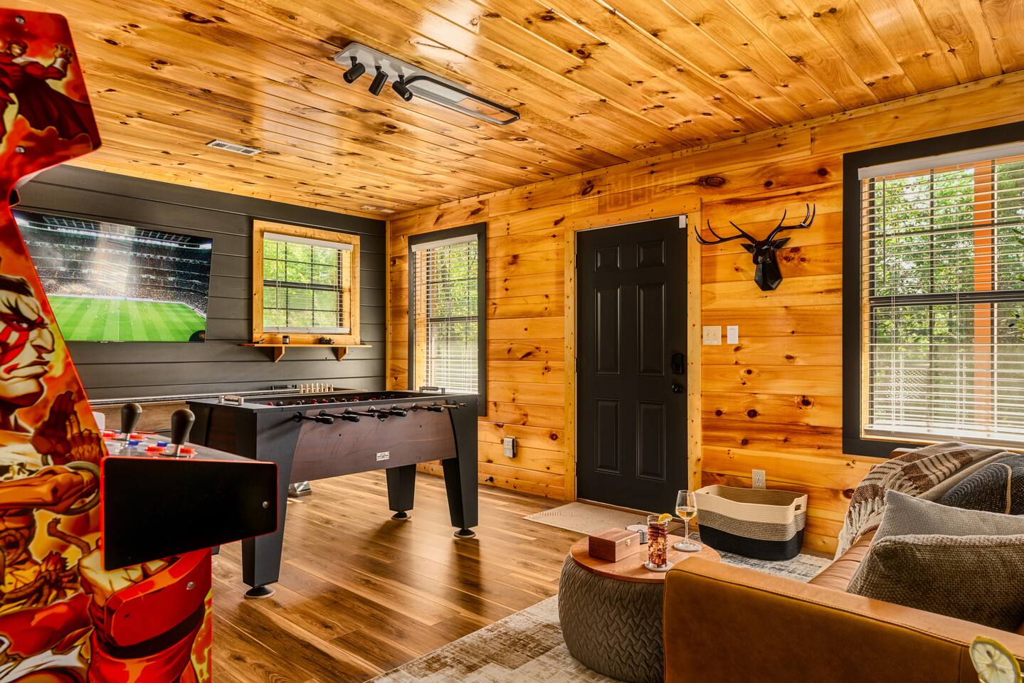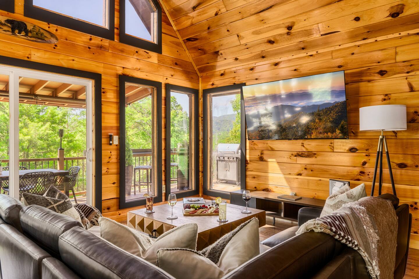 Enjoy a stylish experience at this centrally located cabin with a view! The cabin has gorgeous high cathedral ceilings and big floor to ceiling windows to bring in natural light. Knotty pine tongue and groove throughout. Brand new furniture decorated with a modern, cozy feel. In the morning, relax on the deck while taking in the view of the mountains. In the evening, enjoy the hot tub where you can see the view or relax with family around the fire pit. 11min Drive (typical) to Pkwy attractions HERE ARE A FEW KIND WORDS FROM PAST GUESTS: We have stayed in many cabins in the Great Smokey Mountains area, and this was our favorite by far! It was very easy to get to town from the cabin with smooth, paved roads. The cabin has been recently updated and is beautifully decorated with new furniture and decor. The details did not go unnoticed! I can’t wait to come back again and bring our kids. They would love the indoor and outdoor games. The only thing that could possibly have made our stay better would be to have seen a bear. :) -Andrea My family and I had a fantastic stay. This place was absolutely beautiful, and the interior design was delightful. It was just what we needed. We have no regrets. Our children and their friends built so many memories that I'm sure will last forever. Definitely need to return for a girl's weekend! -Karla Office Business Hours: 8am EST-8pm EST 7 days per week on Airbnb Messenger only. We are owner operated. We are real people with real jobs, just like you! BEDROOMS + BATHROOMS Each of the cabin’s 3 bedrooms is designed with guest comfort in mind. -King size bed - Large Dresser -2 nightstands with lamps -Roku TV Each bathroom is fully stocked for your convenience and comfort. -Shampoo & conditioner -Bodywash -Hand Soap & lotion -Plush towels Fall asleep and wake up refreshed for another exciting (or relaxing!) day in the mountains. Each bedroom is located on a different floor, allowing for privacy. Each bedroom has a King-sized bed. All beds have high quality, comfortable mattresses. Just like the bedrooms, the bathrooms are designed for comfort and relaxation. Each level of the cabin has a full-size bathroom. The main level bathroom and the upper bathroom are also connected to a bedroom, providing a guest suite. The lower-level bathroom is right outside of the lower-level bedroom making it very convenient. The main level has a large garden tub with jets. KITCHEN & DINING The kitchen is outfitted with all the cookware, dishes, utensils, dishwasher pods, and appliances you will need to cook delicious meals. There is a large dining table inside, but in nice weather, you will LOVE eating on the deck at the large dining table with the MOUNTAIN VIEWS. ⛰️ GAME ROOM -Queen size sleeper sofa -3 arcade games…Fast & Furious, Pac-Man and Street Fighter -Large shuffleboard table -Foosball table -Watch the big game on the 65” Smart TV -Full size washer and dryer LOFT STUDY This is a great area to work remotely. There are even beautiful mountain views from the desk! LIVING ROOM -65" Smart (Roku) TV -Sectional couch with mountain views -Cozy area to sit in front of the fireplace DECK -Large dining table with mountain views -Stools with a bar top to sip your coffee -Sitting area and egg chair -Gas grill -String lights LOWER-LEVEL PATIO -7-person hot tub -Porch Swing -Several areas to sit and enjoy family and friends. -2 Egg swings -String lights FIRE PIT -Wood burning fire pit, bring your own firewood or purchase locally. -8 Adirondack chairs -Park style charcoal grill, bring your own charcoal or purchase locally. -String lights CARPORT -This is an area that you can park your car to stay mostly dry on a rainy day or can be used to hang out and stay dry yourself. This is a 3-sided structure with a roof. -Patio lights -Corn hole -Water proof chest for storing outdoor pillows and throws for the fire pit area on cold nights.