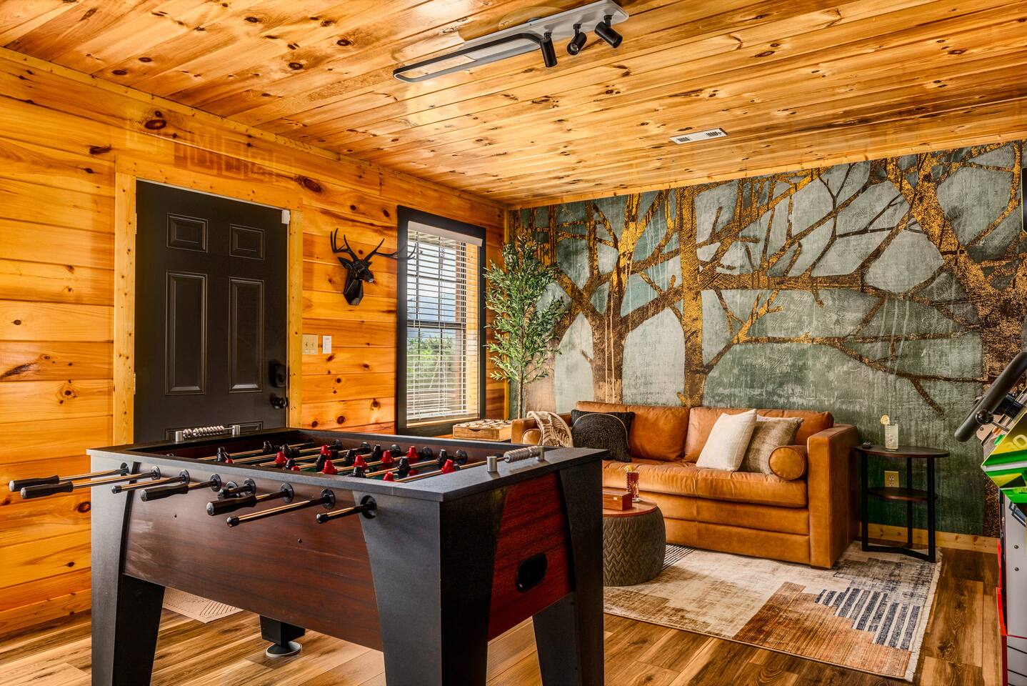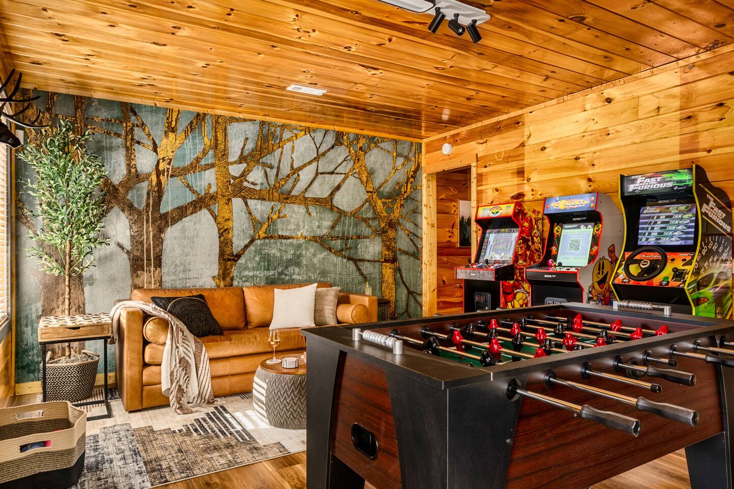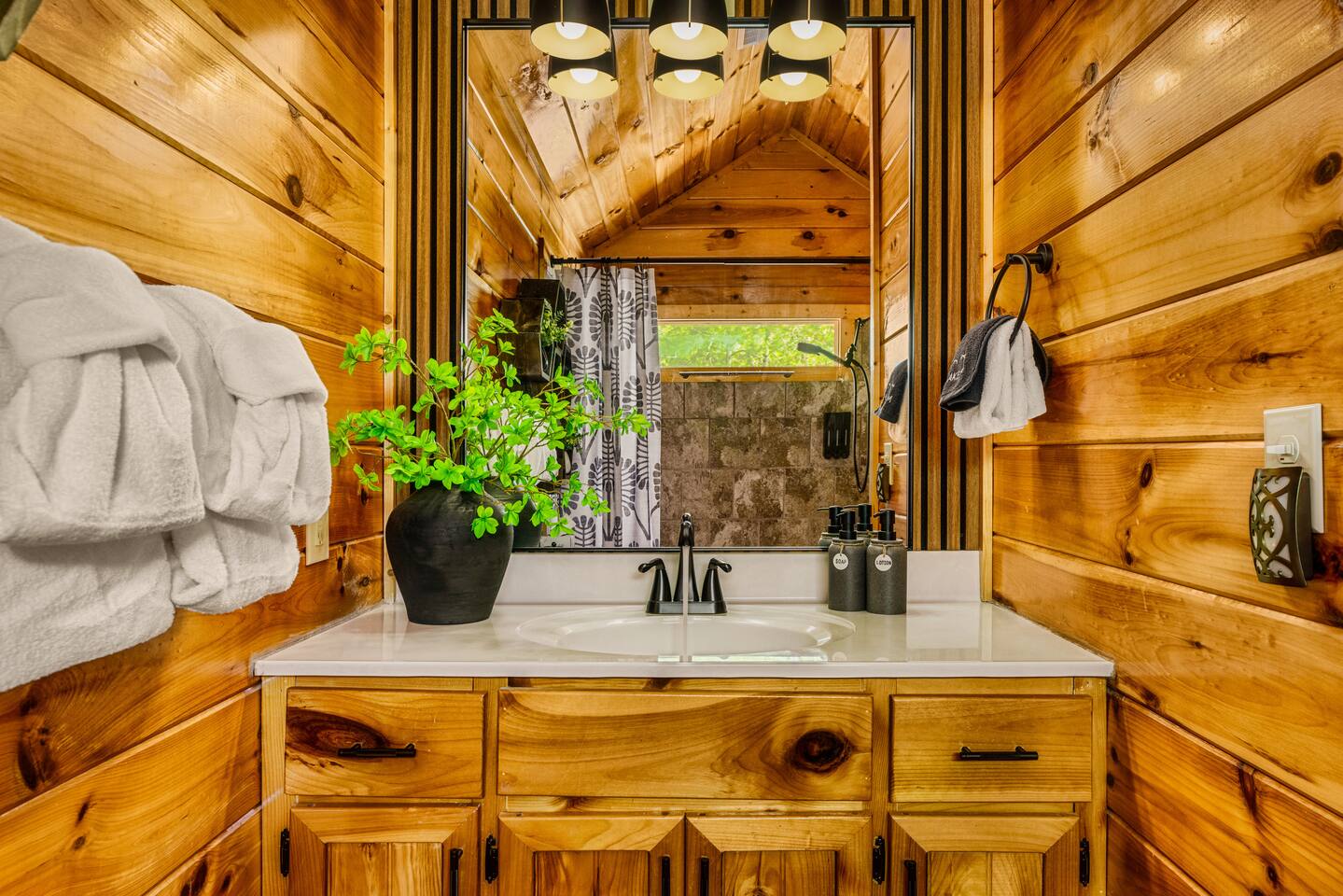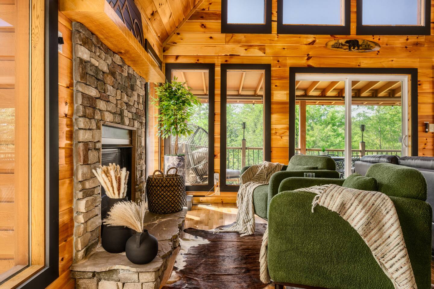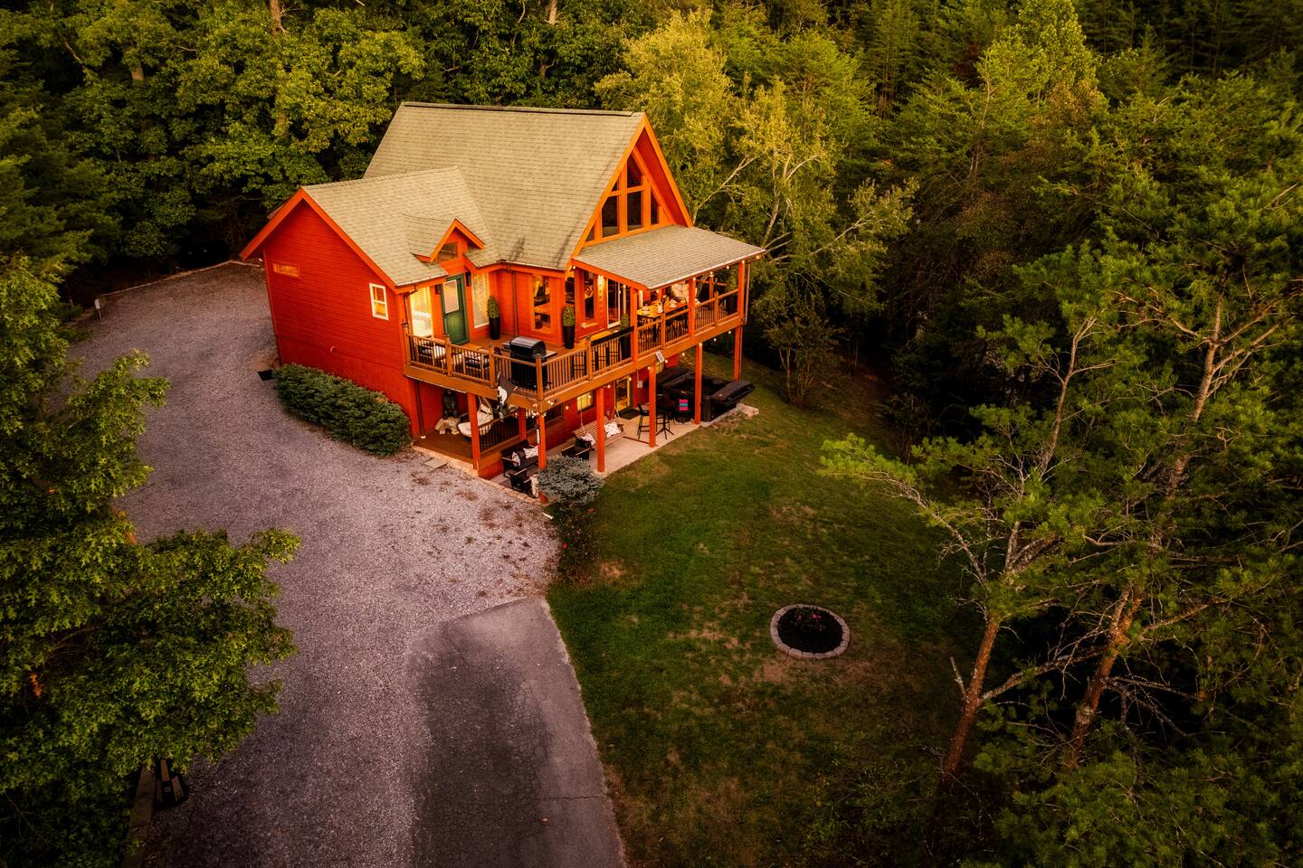 Enjoy a stylish experience at this centrally located cabin with a view! The cabin has gorgeous high cathedral ceilings and big floor to ceiling windows to bring in natural light. Knotty pine tongue and groove throughout. Brand new furniture decorated with a modern, cozy feel. In the morning, relax on the deck while taking in the view of the mountains. In the evening, enjoy the hot tub where you can see the view or relax with family around the fire pit. 11min Drive (typical) to Pkwy attractions HERE ARE A FEW KIND WORDS FROM PAST GUESTS: We have stayed in many cabins in the Great Smokey Mountains area, and this was our favorite by far! It was very easy to get to town from the cabin with smooth, paved roads. The cabin has been recently updated and is beautifully decorated with new furniture and decor. The details did not go unnoticed! I can’t wait to come back again and bring our kids. They would love the indoor and outdoor games. The only thing that could possibly have made our stay better would be to have seen a bear. :) -Andrea My family and I had a fantastic stay. This place was absolutely beautiful, and the interior design was delightful. It was just what we needed. We have no regrets. Our children and their friends built so many memories that I'm sure will last forever. Definitely need to return for a girl's weekend! -Karla Office Business Hours: 8am EST-8pm EST 7 days per week on Airbnb Messenger only. We are owner operated. We are real people with real jobs, just like you! BEDROOMS + BATHROOMS Each of the cabin’s 3 bedrooms is designed with guest comfort in mind. -King size bed - Large Dresser -2 nightstands with lamps -Roku TV Each bathroom is fully stocked for your convenience and comfort. -Shampoo & conditioner -Bodywash -Hand Soap & lotion -Plush towels Fall asleep and wake up refreshed for another exciting (or relaxing!) day in the mountains. Each bedroom is located on a different floor, allowing for privacy. Each bedroom has a King-sized bed. All beds have high quality, comfortable mattresses. Just like the bedrooms, the bathrooms are designed for comfort and relaxation. Each level of the cabin has a full-size bathroom. The main level bathroom and the upper bathroom are also connected to a bedroom, providing a guest suite. The lower-level bathroom is right outside of the lower-level bedroom making it very convenient. The main level has a large garden tub with jets. KITCHEN & DINING The kitchen is outfitted with all the cookware, dishes, utensils, dishwasher pods, and appliances you will need to cook delicious meals. There is a large dining table inside, but in nice weather, you will LOVE eating on the deck at the large dining table with the MOUNTAIN VIEWS. ⛰️ GAME ROOM -Queen size sleeper sofa -3 arcade games…Fast & Furious, Pac-Man and Street Fighter -Large shuffleboard table -Foosball table -Watch the big game on the 65” Smart TV -Full size washer and dryer LOFT STUDY This is a great area to work remotely. There are even beautiful mountain views from the desk! LIVING ROOM -65" Smart (Roku) TV -Sectional couch with mountain views -Cozy area to sit in front of the fireplace DECK -Large dining table with mountain views -Stools with a bar top to sip your coffee -Sitting area and egg chair -Gas grill -String lights LOWER-LEVEL PATIO -7-person hot tub -Porch Swing -Several areas to sit and enjoy family and friends. -2 Egg swings -String lights FIRE PIT -Wood burning fire pit, bring your own firewood or purchase locally. -8 Adirondack chairs -Park style charcoal grill, bring your own charcoal or purchase locally. -String lights CARPORT -This is an area that you can park your car to stay mostly dry on a rainy day or can be used to hang out and stay dry yourself. This is a 3-sided structure with a roof. -Patio lights -Corn hole -Water proof chest for storing outdoor pillows and throws for the fire pit area on cold nights.