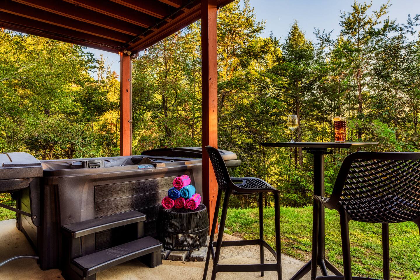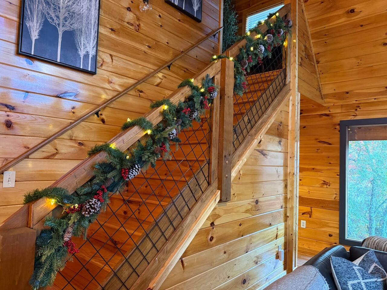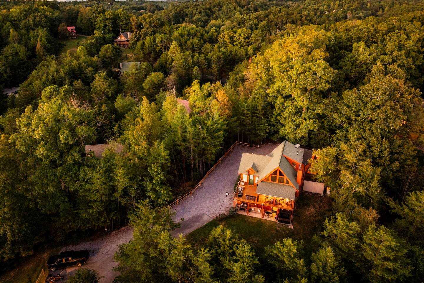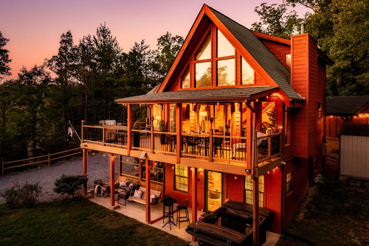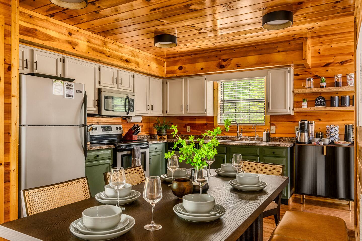 Enjoy a stylish experience at this centrally located cabin with a view! The cabin has gorgeous high cathedral ceilings and big floor to ceiling windows to bring in natural light. Knotty pine tongue and groove throughout. Brand new furniture decorated with a modern, cozy feel. In the morning, relax on the deck while taking in the view of the mountains. In the evening, enjoy the hot tub where you can see the view or relax with family around the fire pit. 11min Drive (typical) to Pkwy attractions HERE ARE A FEW KIND WORDS FROM PAST GUESTS: We have stayed in many cabins in the Great Smokey Mountains area, and this was our favorite by far! It was very easy to get to town from the cabin with smooth, paved roads. The cabin has been recently updated and is beautifully decorated with new furniture and decor. The details did not go unnoticed! I can’t wait to come back again and bring our kids. They would love the indoor and outdoor games. The only thing that could possibly have made our stay better would be to have seen a bear. :) -Andrea My family and I had a fantastic stay. This place was absolutely beautiful, and the interior design was delightful. It was just what we needed. We have no regrets. Our children and their friends built so many memories that I'm sure will last forever. Definitely need to return for a girl's weekend! -Karla Office Business Hours: 8am EST-8pm EST 7 days per week on Airbnb Messenger only. We are owner operated. We are real people with real jobs, just like you! BEDROOMS + BATHROOMS Each of the cabin’s 3 bedrooms is designed with guest comfort in mind. -King size bed - Large Dresser -2 nightstands with lamps -Roku TV Each bathroom is fully stocked for your convenience and comfort. -Shampoo & conditioner -Bodywash -Hand Soap & lotion -Plush towels Fall asleep and wake up refreshed for another exciting (or relaxing!) day in the mountains. Each bedroom is located on a different floor, allowing for privacy. Each bedroom has a King-sized bed. All beds have high quality, comfortable mattresses. Just like the bedrooms, the bathrooms are designed for comfort and relaxation. Each level of the cabin has a full-size bathroom. The main level bathroom and the upper bathroom are also connected to a bedroom, providing a guest suite. The lower-level bathroom is right outside of the lower-level bedroom making it very convenient. The main level has a large garden tub with jets. KITCHEN & DINING The kitchen is outfitted with all the cookware, dishes, utensils, dishwasher pods, and appliances you will need to cook delicious meals. There is a large dining table inside, but in nice weather, you will LOVE eating on the deck at the large dining table with the MOUNTAIN VIEWS. ⛰️ GAME ROOM -Queen size sleeper sofa -3 arcade games…Fast & Furious, Pac-Man and Street Fighter -Large shuffleboard table -Foosball table -Watch the big game on the 65” Smart TV -Full size washer and dryer LOFT STUDY This is a great area to work remotely. There are even beautiful mountain views from the desk! LIVING ROOM -65" Smart (Roku) TV -Sectional couch with mountain views -Cozy area to sit in front of the fireplace DECK -Large dining table with mountain views -Stools with a bar top to sip your coffee -Sitting area and egg chair -Gas grill -String lights LOWER-LEVEL PATIO -7-person hot tub -Porch Swing -Several areas to sit and enjoy family and friends. -2 Egg swings -String lights FIRE PIT -Wood burning fire pit, bring your own firewood or purchase locally. -8 Adirondack chairs -Park style charcoal grill, bring your own charcoal or purchase locally. -String lights CARPORT -This is an area that you can park your car to stay mostly dry on a rainy day or can be used to hang out and stay dry yourself. This is a 3-sided structure with a roof. -Patio lights -Corn hole -Water proof chest for storing outdoor pillows and throws for the fire pit area on cold nights.